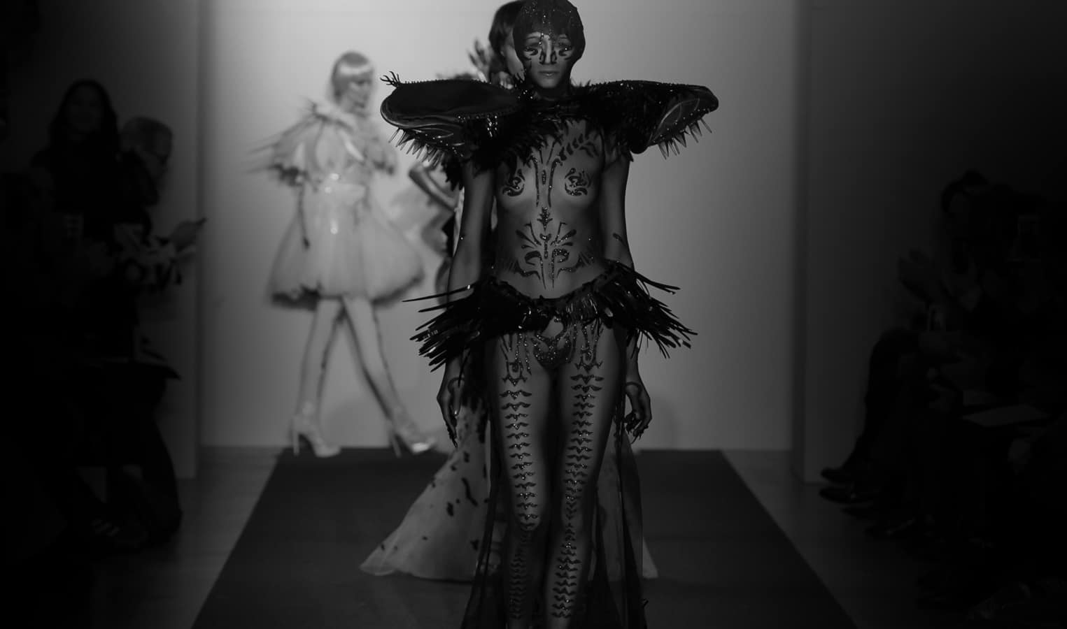 Galons frissonnants et pétales abstraites de rhodoïd ponctuent cette collection aux formes futuristes et aux mouvements intemporels. La douceur de la soie, la dentelle évaporée et les plumes délicates flottent dans un temps suspendu. A la manière d’une peinture surréaliste, les formes et les silhouettes s’opposent et se complètent.