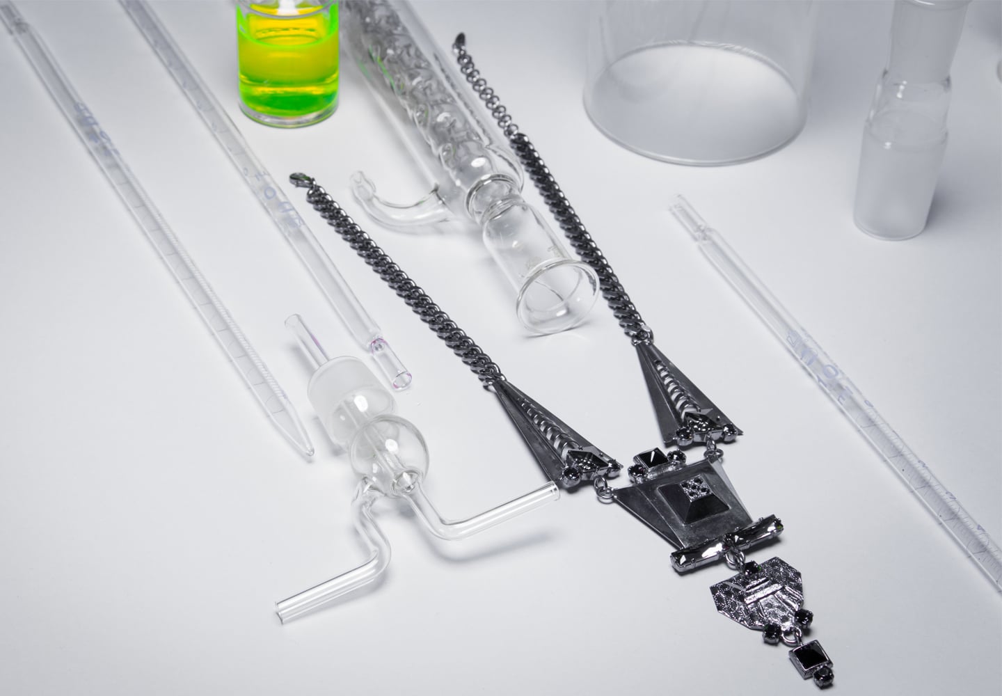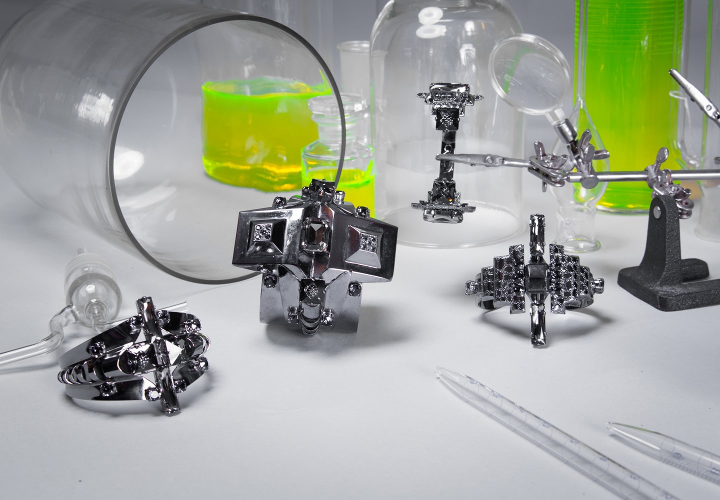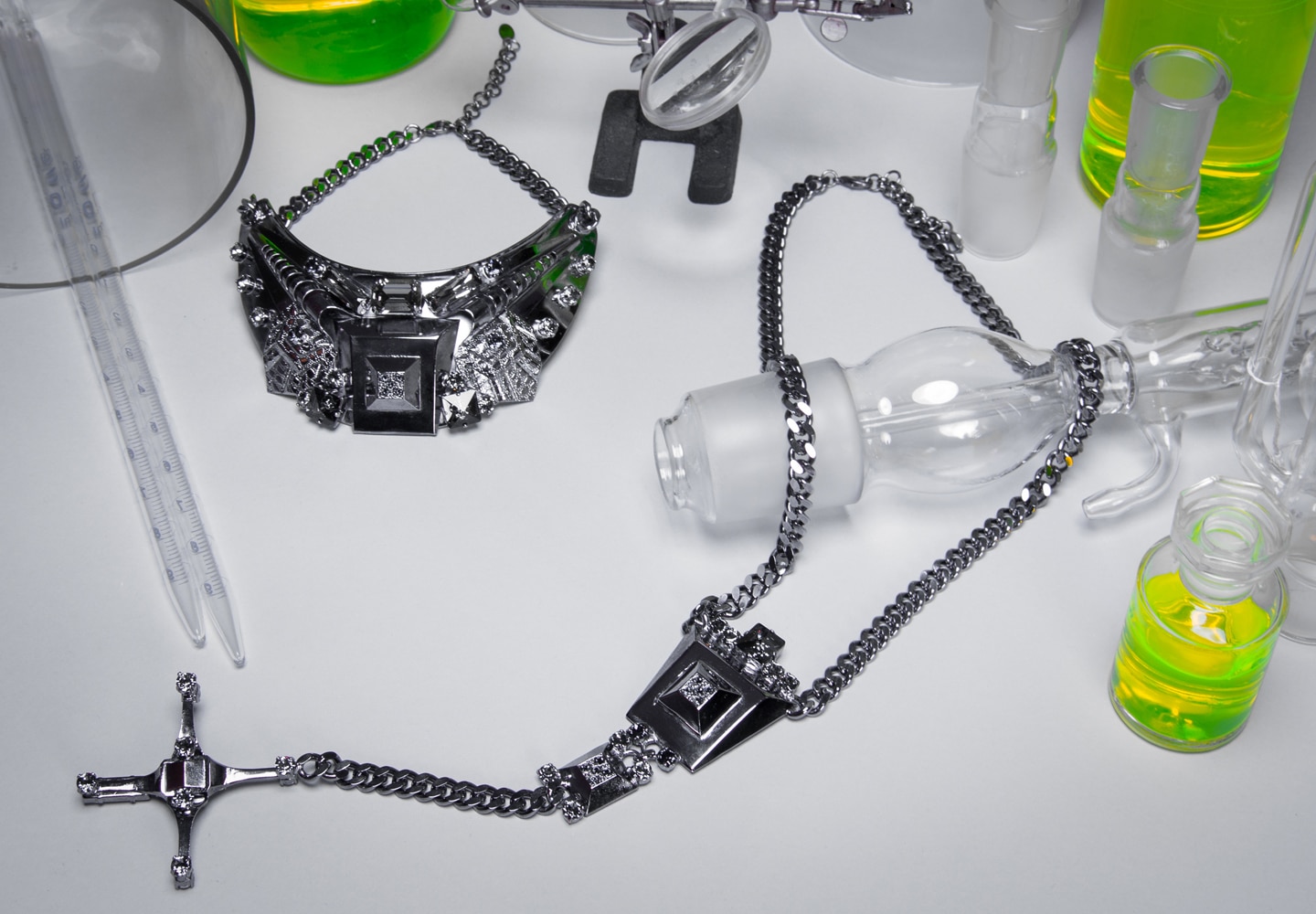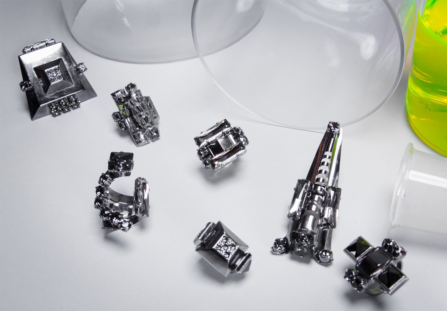 Pour cette ligne, On Aura tout vu continue d’explorer les limites de l’unisexe avec des bijoux androgynes aux volumes géométriques. Des parures visuellement imposantes semblant tout droit sortie dune fiction futuriste dont la palette de couleurs « dark » accentue le mystère.