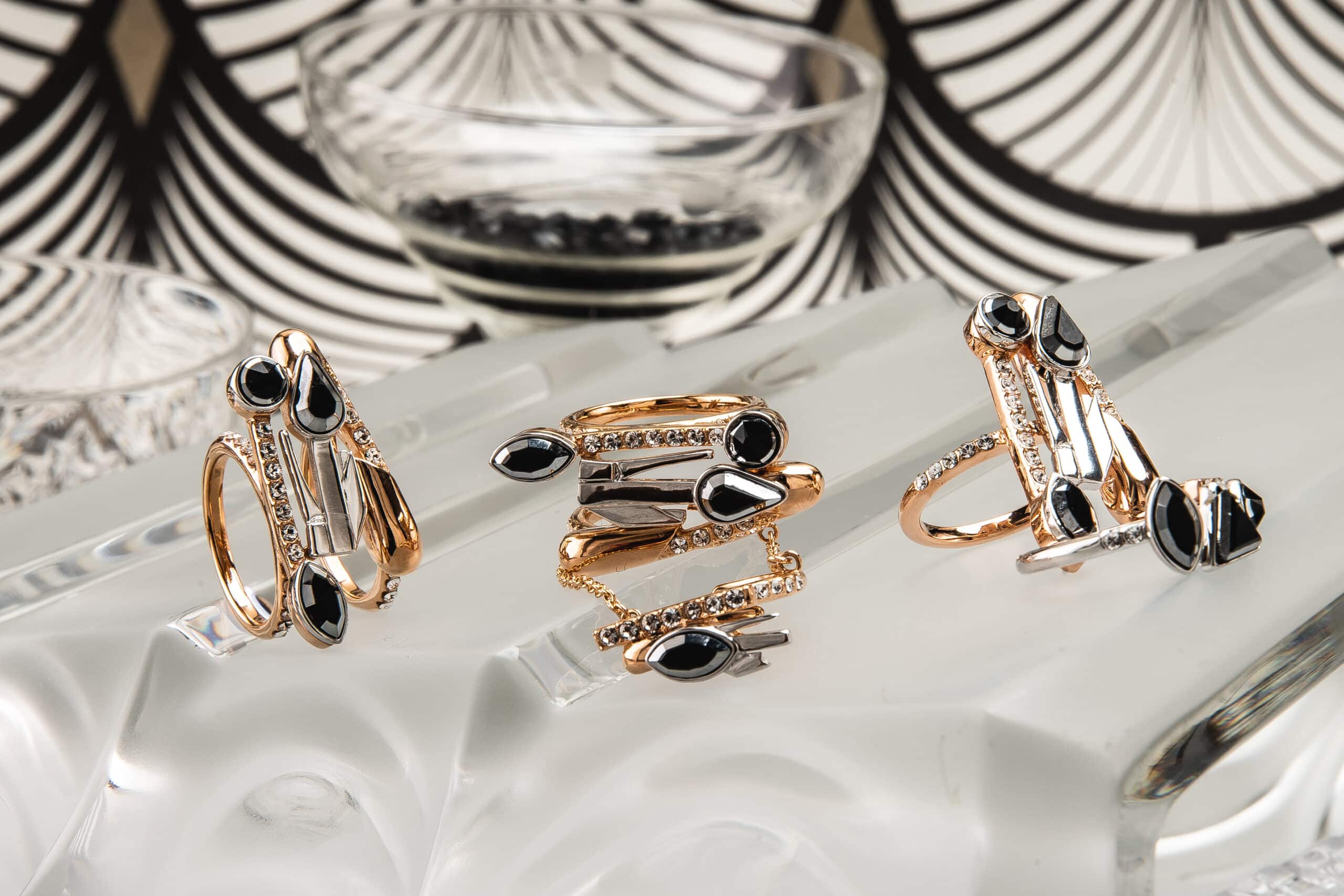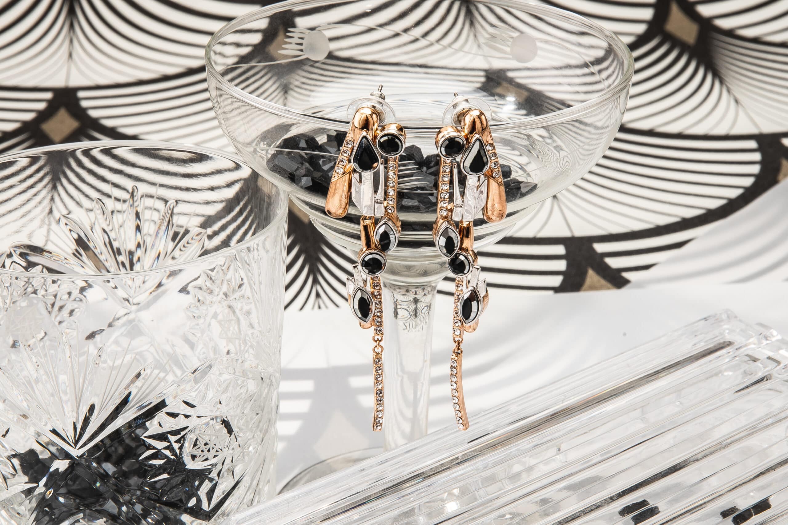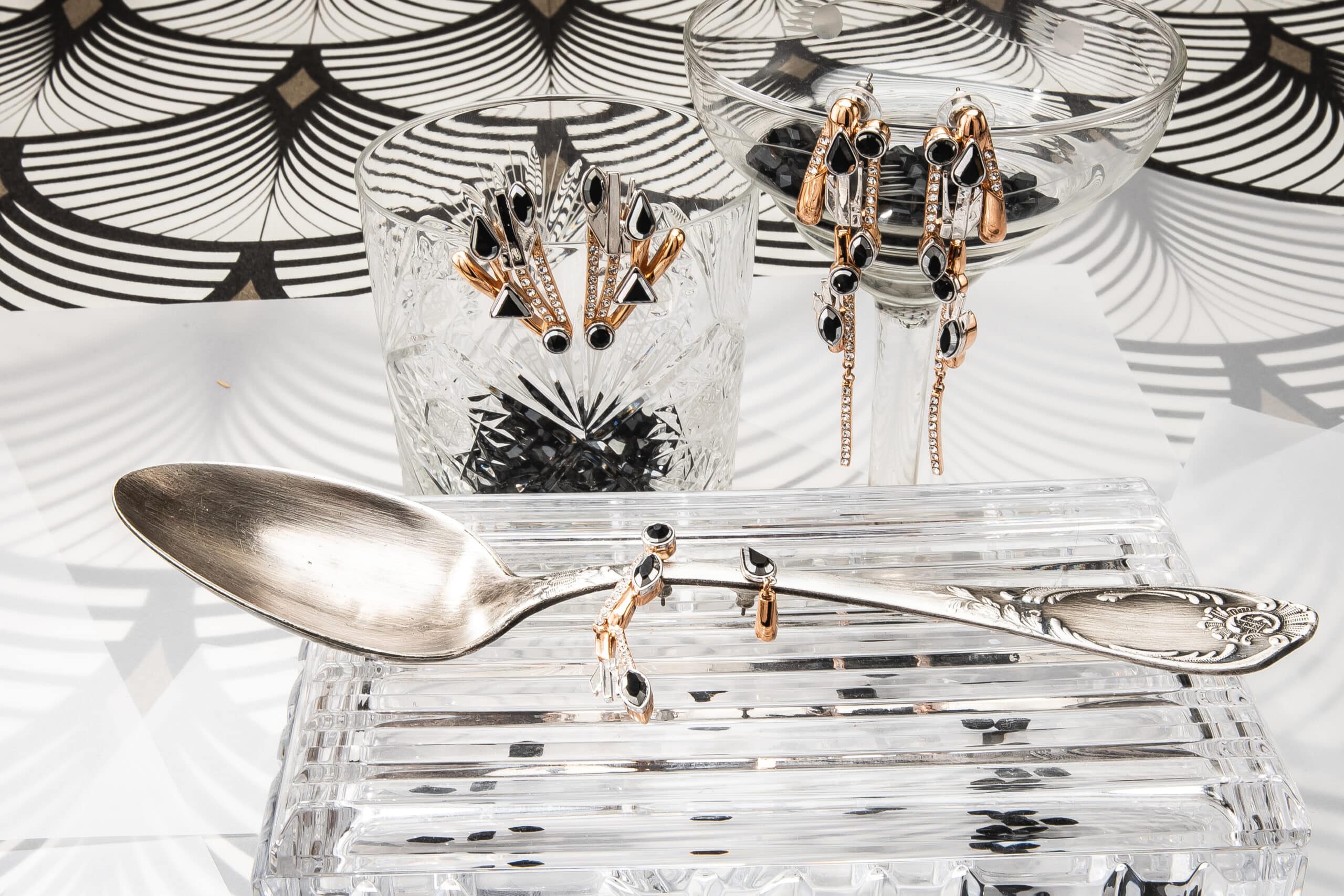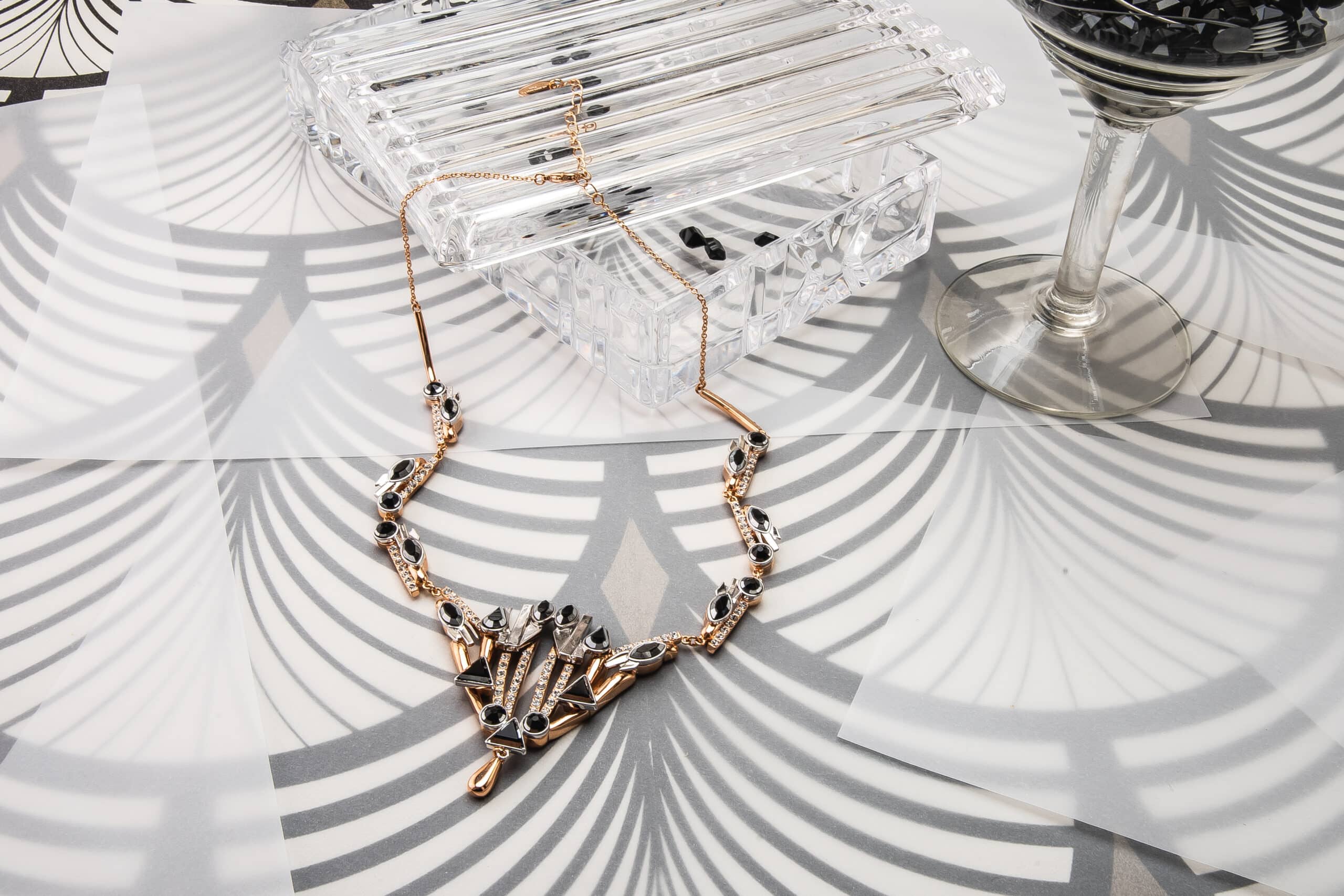Les accessoires scintillants par ON AURA TOUT VU XXe siècle Inspirée par Gloria Swanson, Zelda Sayre épouse de F. Scott Fitzgerald, Joséphine Baker et des femmes folles émancipées qui sont devenues de nouveaux modèles : la femme forte, indépendante, capable de prendre soin d’elle, et de rendre sa vie glamour comme fête… Des bijoux rétro futuristes qui bousculent le passé et le présent. En utilisant des navettes en cristal noir, des cristaux à facettes triangle et goutte bicolores, nous définissons le style et mettons en valeur la puissance et la sensualité avec des graphismes Art Déco. Une sensation vintage de luxe contemporain avec de longues boucles d’oreilles, des pendentifs et des colliers géométriques qui reflètent le glamour du passé et du présent.