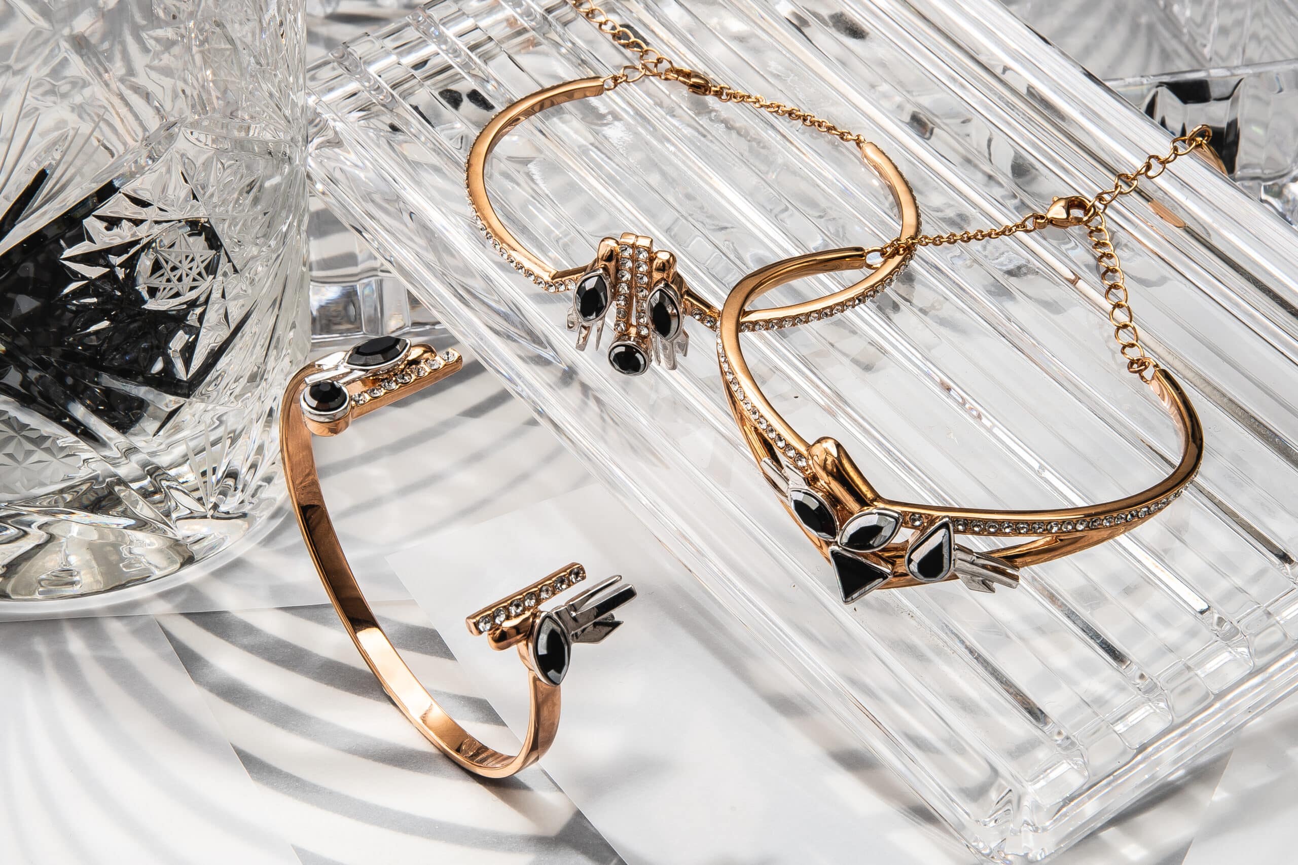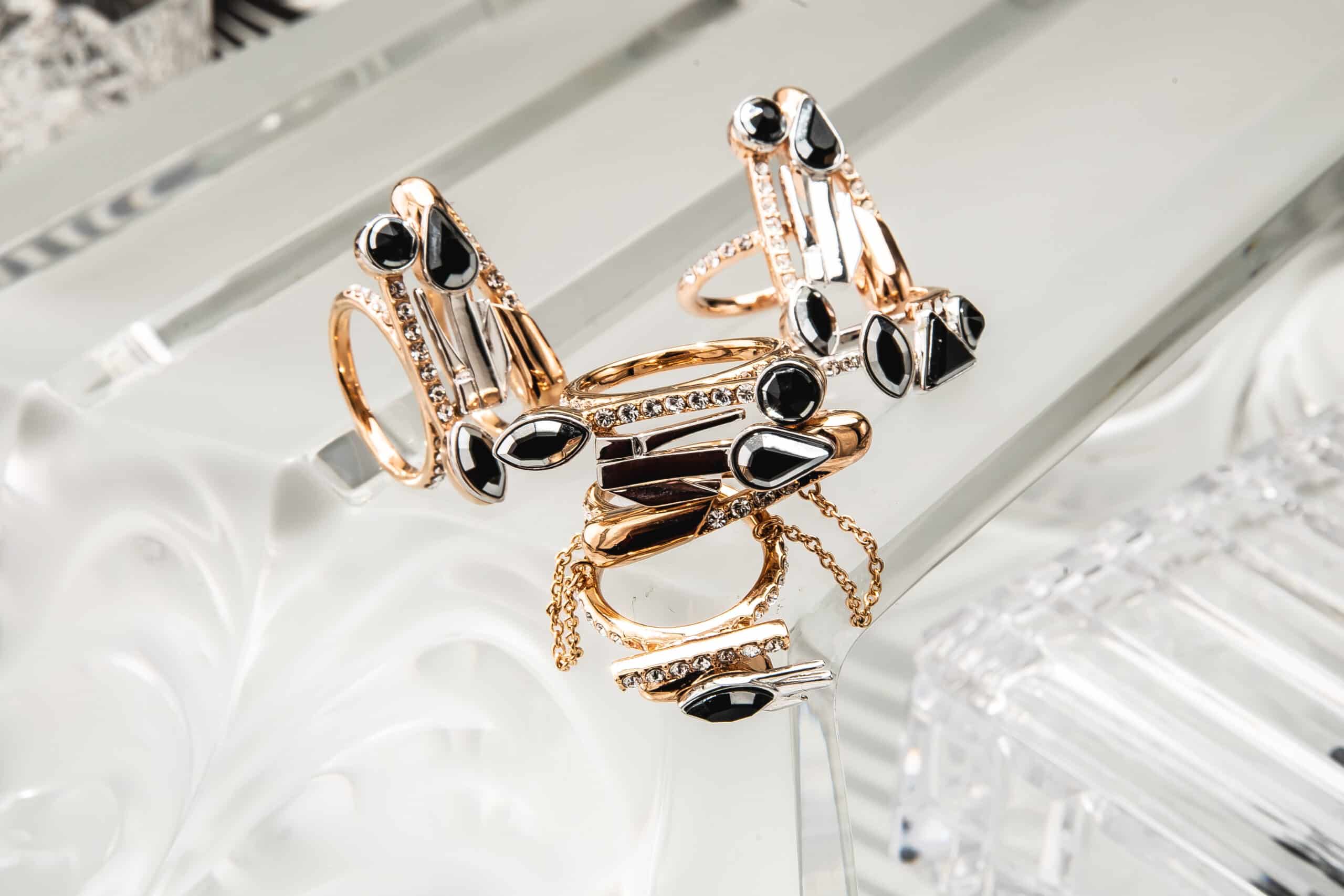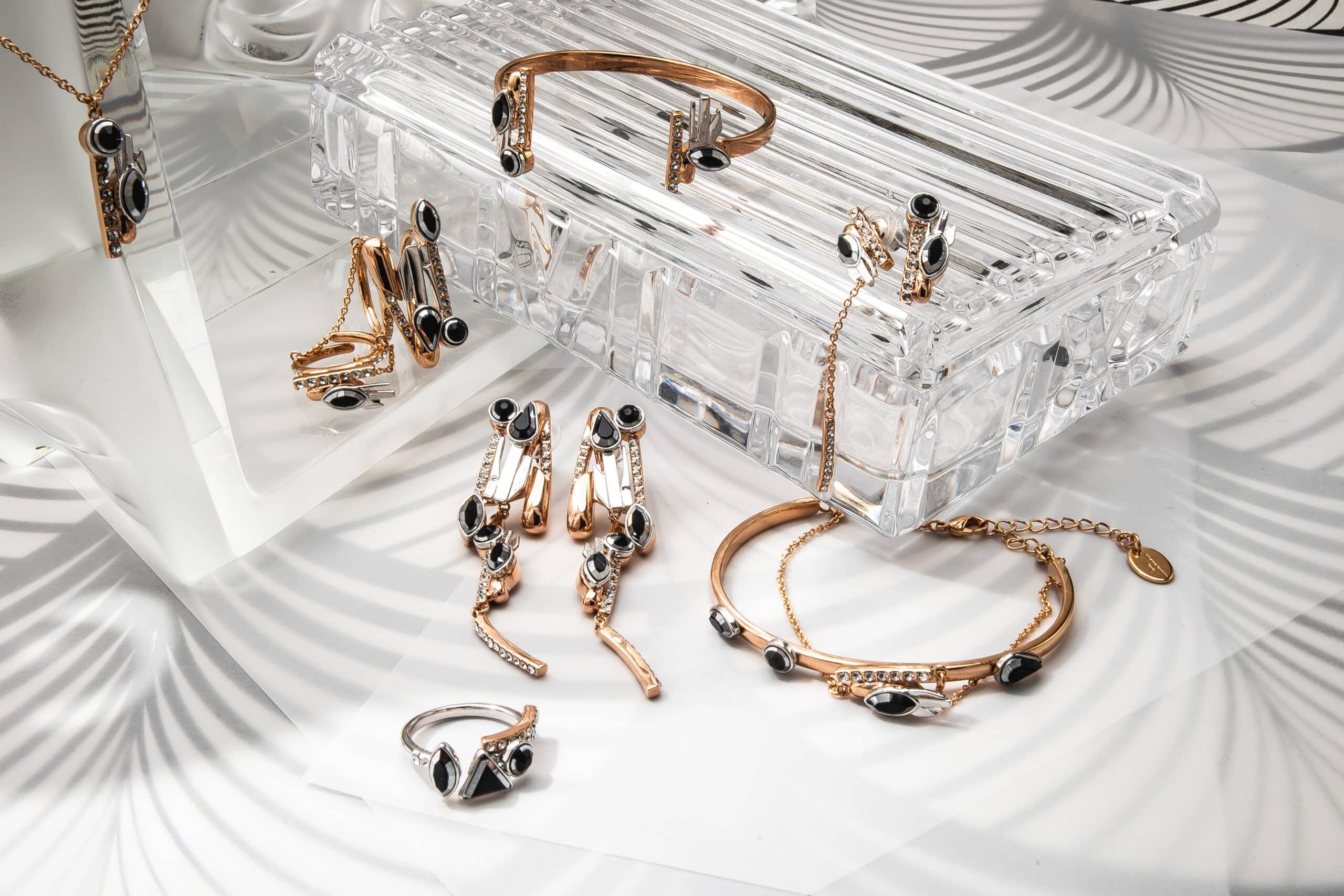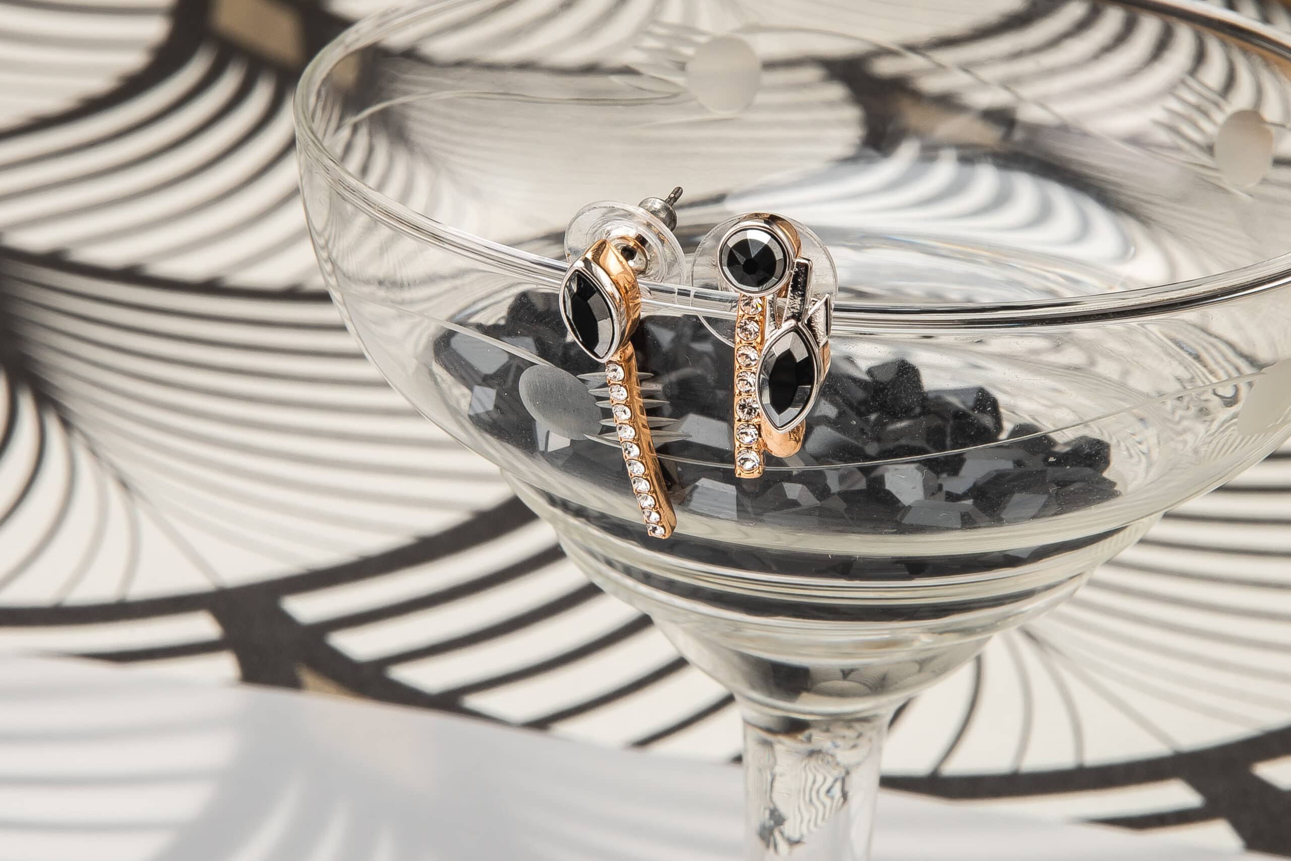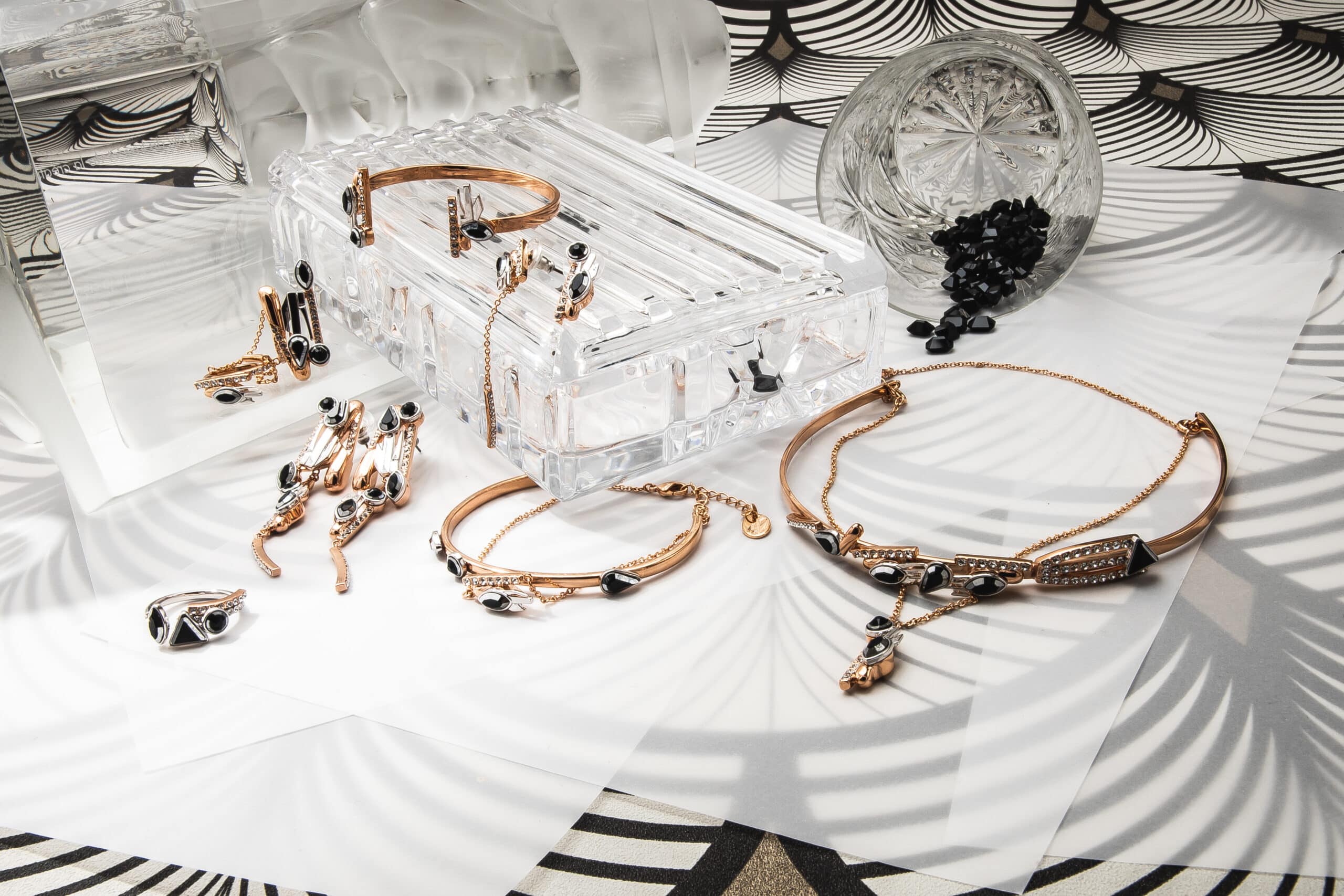 Les accessoires scintillants par ON AURA TOUT VU XXe siècle Inspirée par Gloria Swanson, Zelda Sayre épouse de F. Scott Fitzgerald, Joséphine Baker et des femmes folles émancipées qui sont devenues de nouveaux modèles : la femme forte, indépendante, capable de prendre soin d’elle, et de rendre sa vie glamour comme fête… Des bijoux rétro futuristes qui bousculent le passé et le présent. En utilisant des navettes en cristal noir, des cristaux à facettes triangle et goutte bicolores, nous définissons le style et mettons en valeur la puissance et la sensualité avec des graphismes Art Déco. Une sensation vintage de luxe contemporain avec de longues boucles d’oreilles, des pendentifs et des colliers géométriques qui reflètent le glamour du passé et du présent.